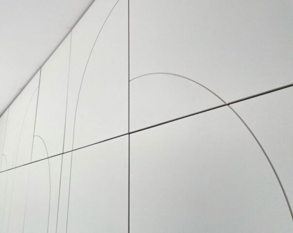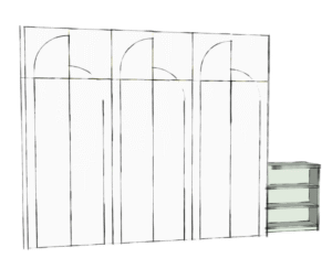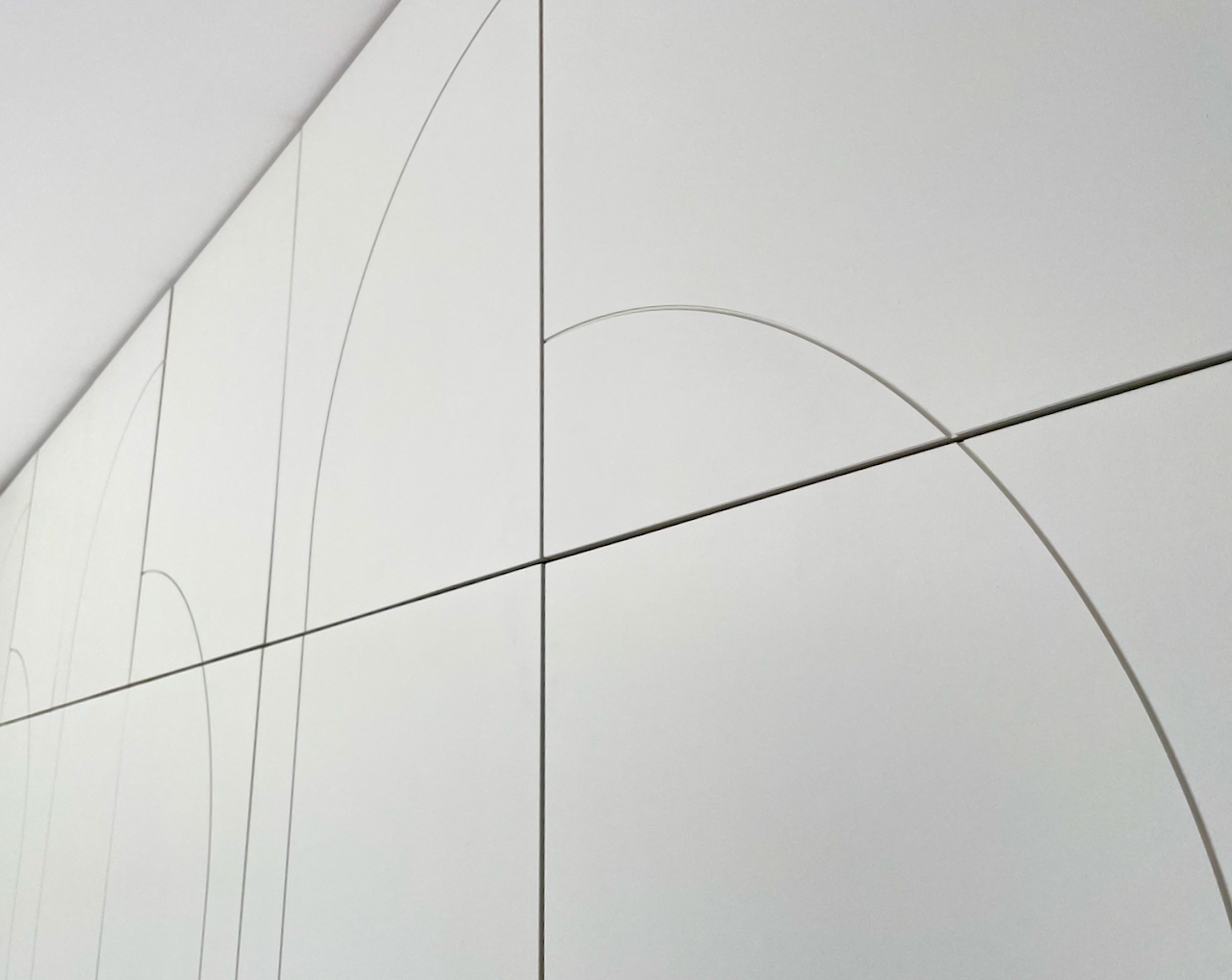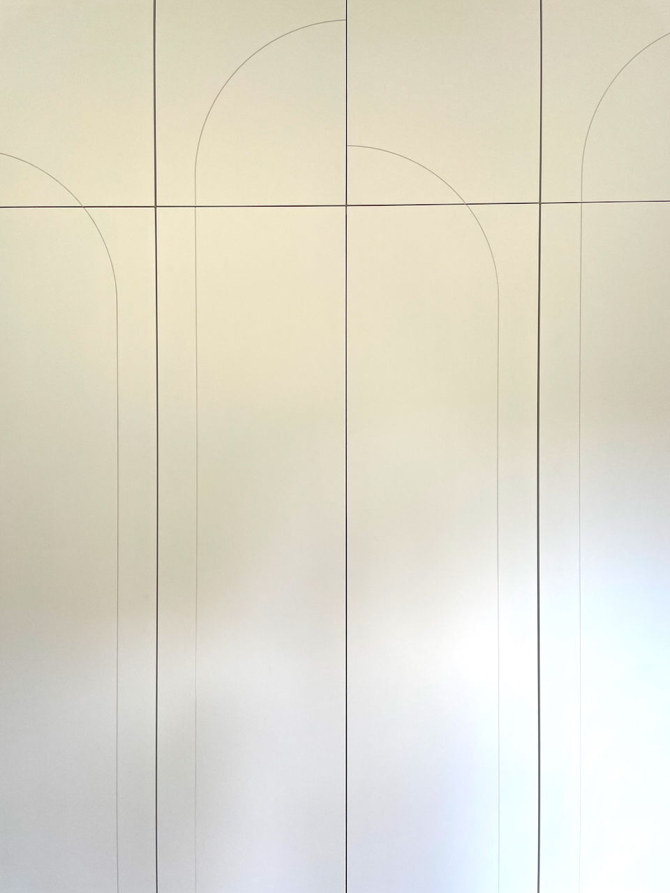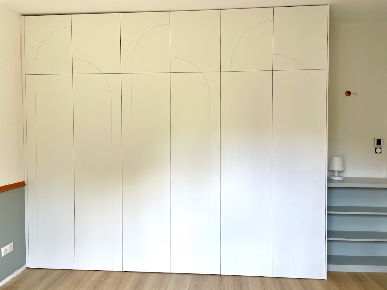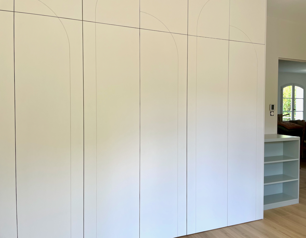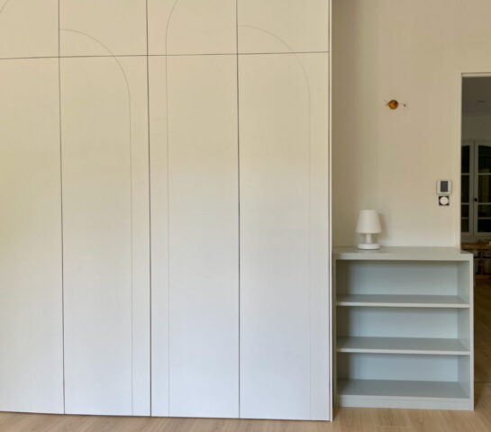 Les portes du dressing sont fabriquées en MDF peint, coloris Strong White (Farrow & Ball), habillées d’une fine rainure dessinant un discret motif aux allures Art Déco