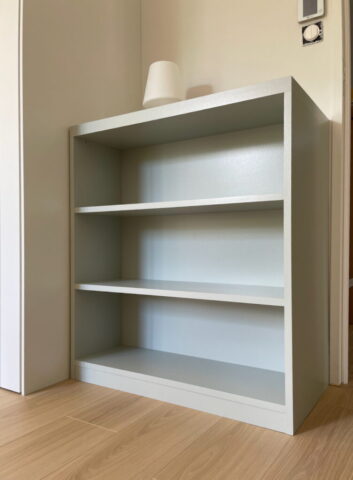Le meuble bibliothèque est également en MDF peint, coloris Light Blue (Farrow & Ball)